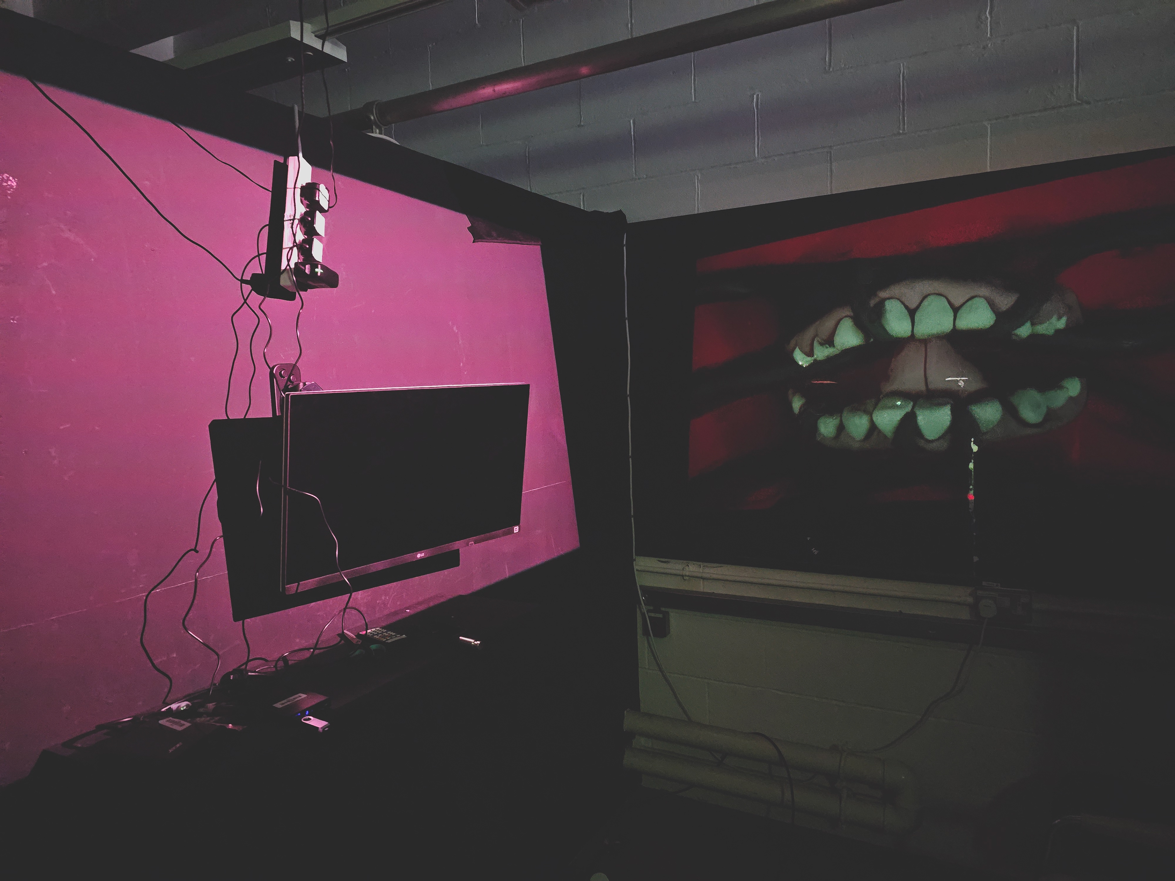 For the installation, I had to adapt my original plans to fit the spaces available during the show and ultimately transformed one of the stop-motion booths into an immersive environment. I cleared the equipment, repainted the walls, and added a black curtain entrance to separate it from the main exhibition. Using simple media players and three speakers, I created looping visuals with layered soundtracks that produced a disorientating surround-sound effect. The space felt isolated and eerie, and feedback confirmed the contrasts of quiet and sudden sound worked effectively, making the experience both unsettling and memorable.